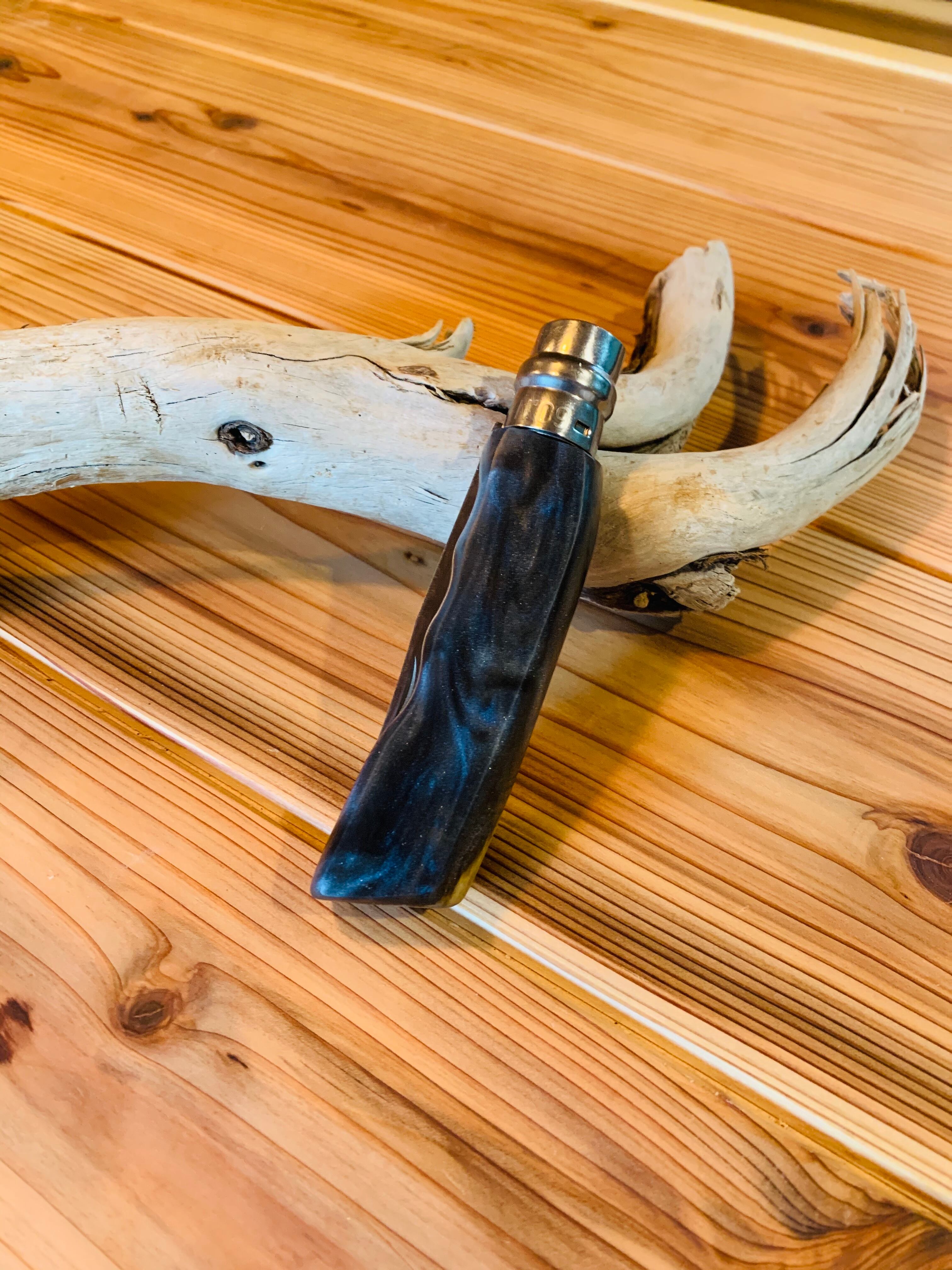 流木とレジンで製作したオピネルNo09カスタムナイフになります。