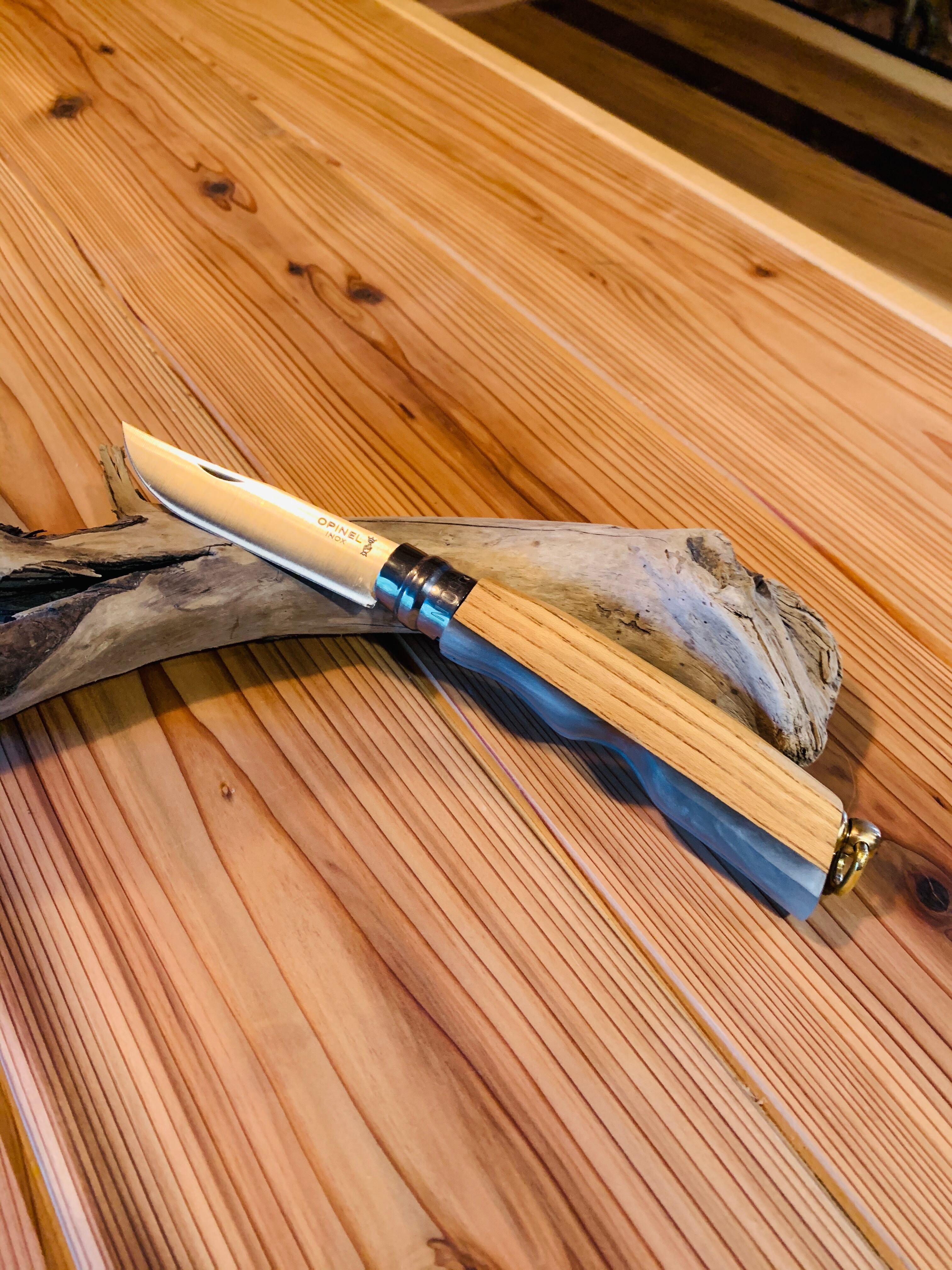 オピネルナイフのNo09を木材とレジンでカスタムした商品になります。