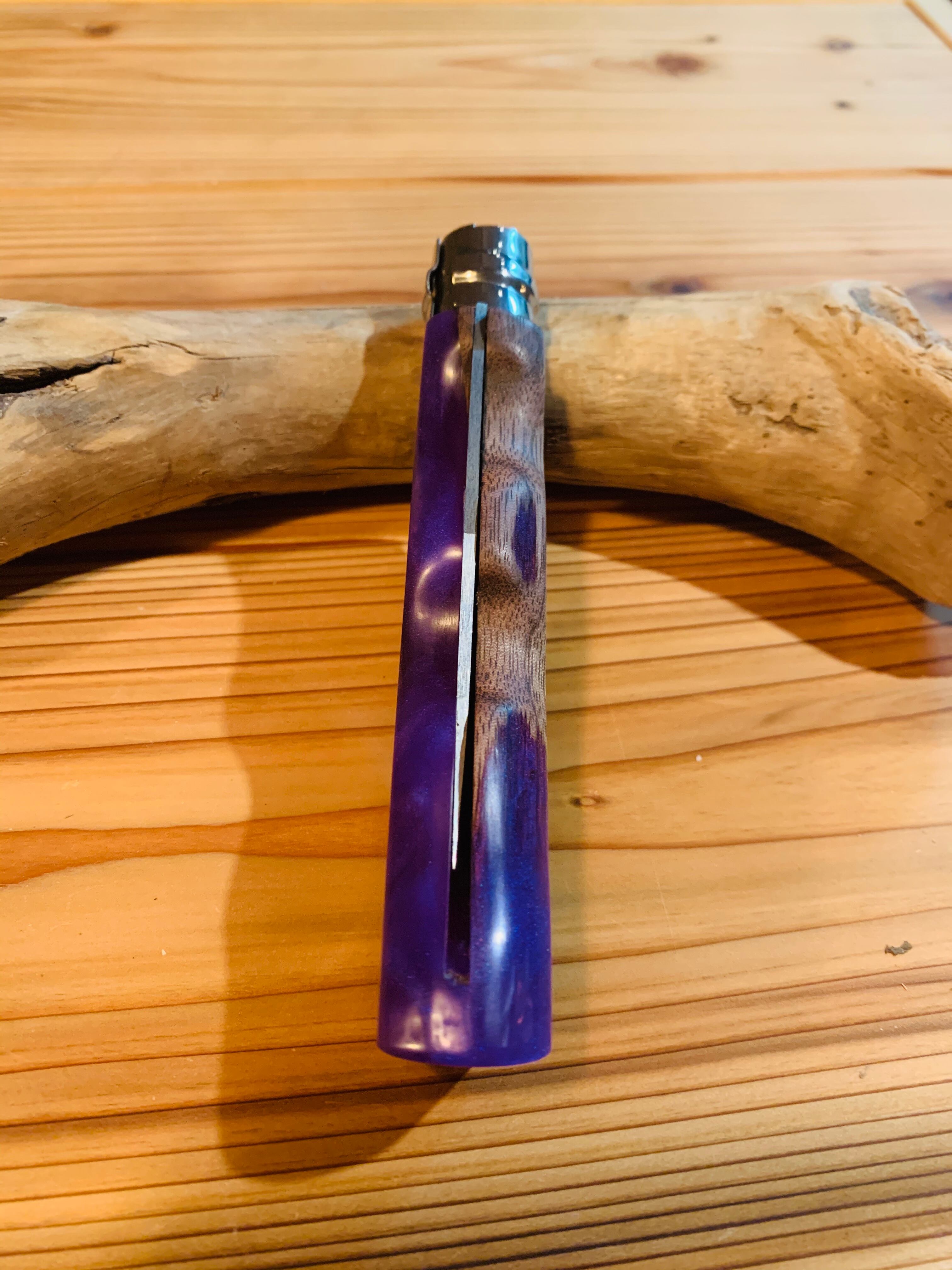 オピネルナイフNo09を木材とレジンでカスタムした商品になります。