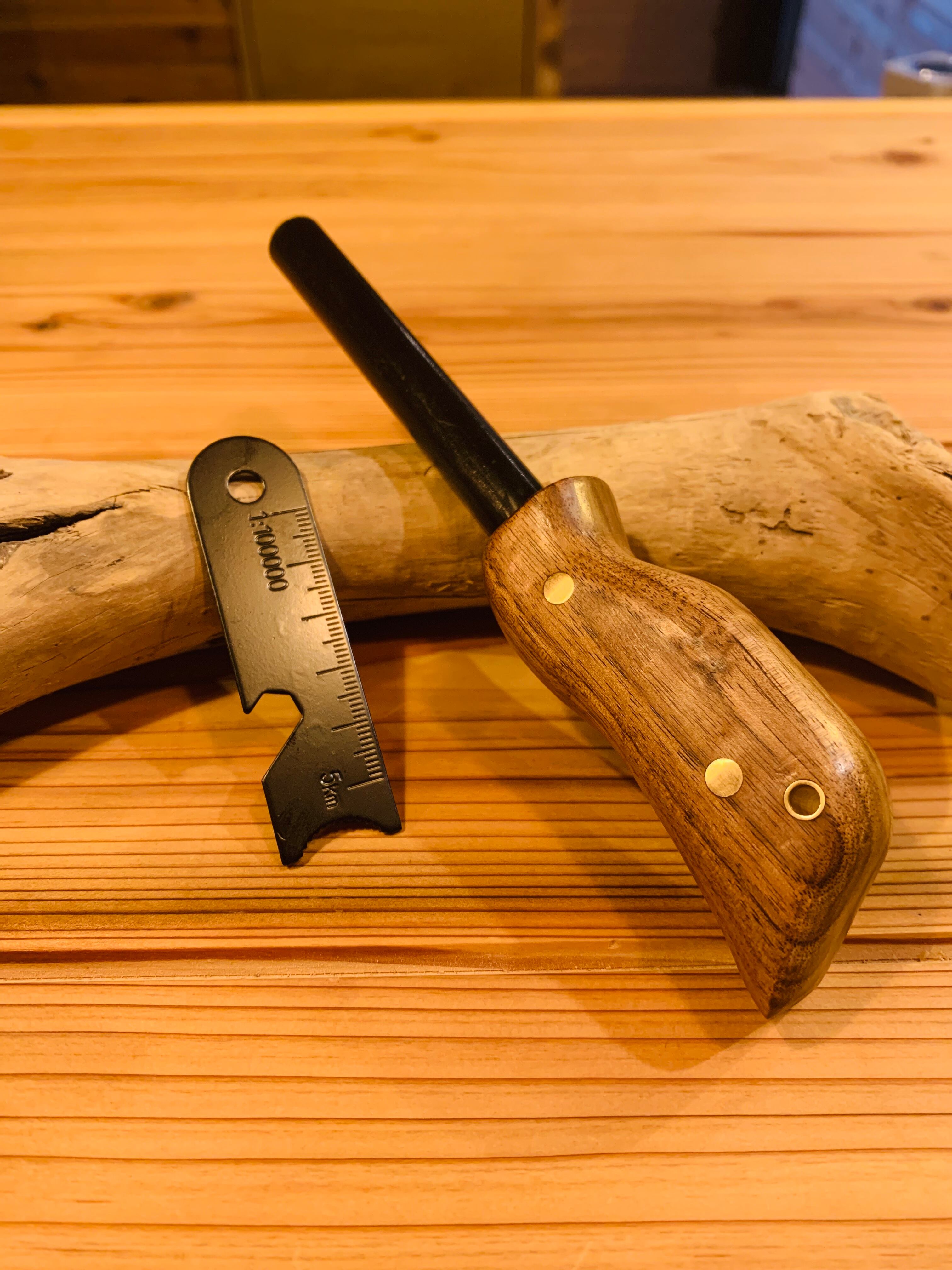 ファイヤースターターはグリップ部分をライフルの柄をイメージして製作。とても握りやすく、手にフィットするので、火起こし時の手の疲れを軽減してくれると思います。